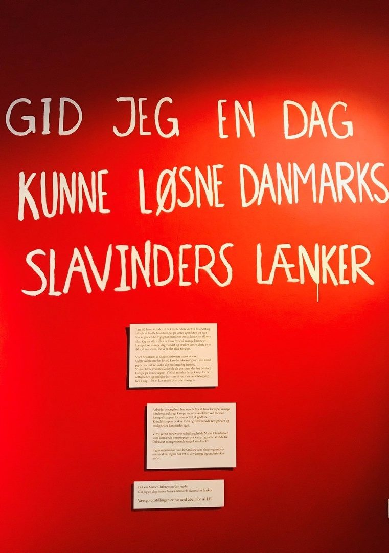 Set på tv: Skattejagt på Museet udstilling Hjem // Det sker // Udstillinger // Tidligere udstillinger // Set på tv: Skattejagt på Museet udstilling Menu Udstilling af Lisbeth Wullf og Rasmus Botoft, lavet til tv-programmet Skattejagt på Museet. Udstillingen lukkede 31/7 2023 I et rødt rum med udsigt til festsalens smukke loft og balkon, kan du opleve en helt særlig udstilling med titlen: ‘Gid jeg en dag kunne løsne Danmarks slavinders lænker”. Den er blevet til i forbindelse med optagelserne til DR-programmet Skattejagt på Museet. Her går skuespillerne Lisbeth Wulff og Rasmus Botoft på skattejagt i vores samlinger og magasiner. De finder genstande og historier, som ikke normalt bliver fortalt på museet. Sammen udvælger de historien om Marie Christensen og tjenestepigernes kamp for bedre vilkår som emne for udstillingen Til åbningstalen for udstillingen sagde Lisbeth og Rasmus: ”Vi vil gerne med vores udstilling hylde Marie Christensen, som kæmpede tjenestepigernes kamp, og alene fik forbedret mange tusinde unge kvinders liv. Ingen mennesker skal behandles som slaver og undermennesker. Ingen har ret til at undertrykke og ydmyge andre.” Har du endnu ikke set tv-programmet, så kan det streames her på DR.dk Foto: DR